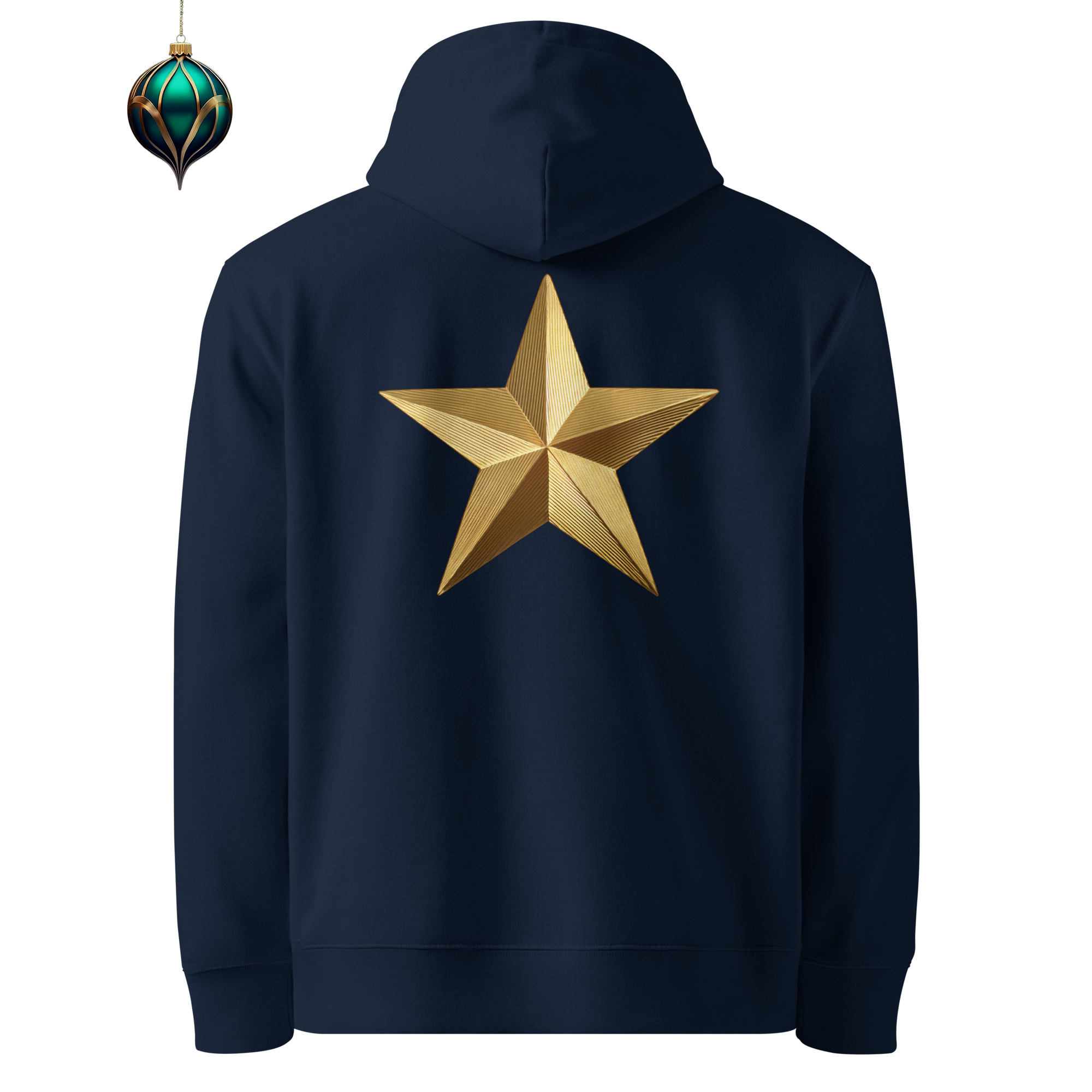 Stjerne - Økologisk Bomulds Hættetrøje i Navy Blue har VISUDECO® bogstaverne og logoet broderet foran på venstre bryst og et gyldent stjernedesign trykt på ryggen.