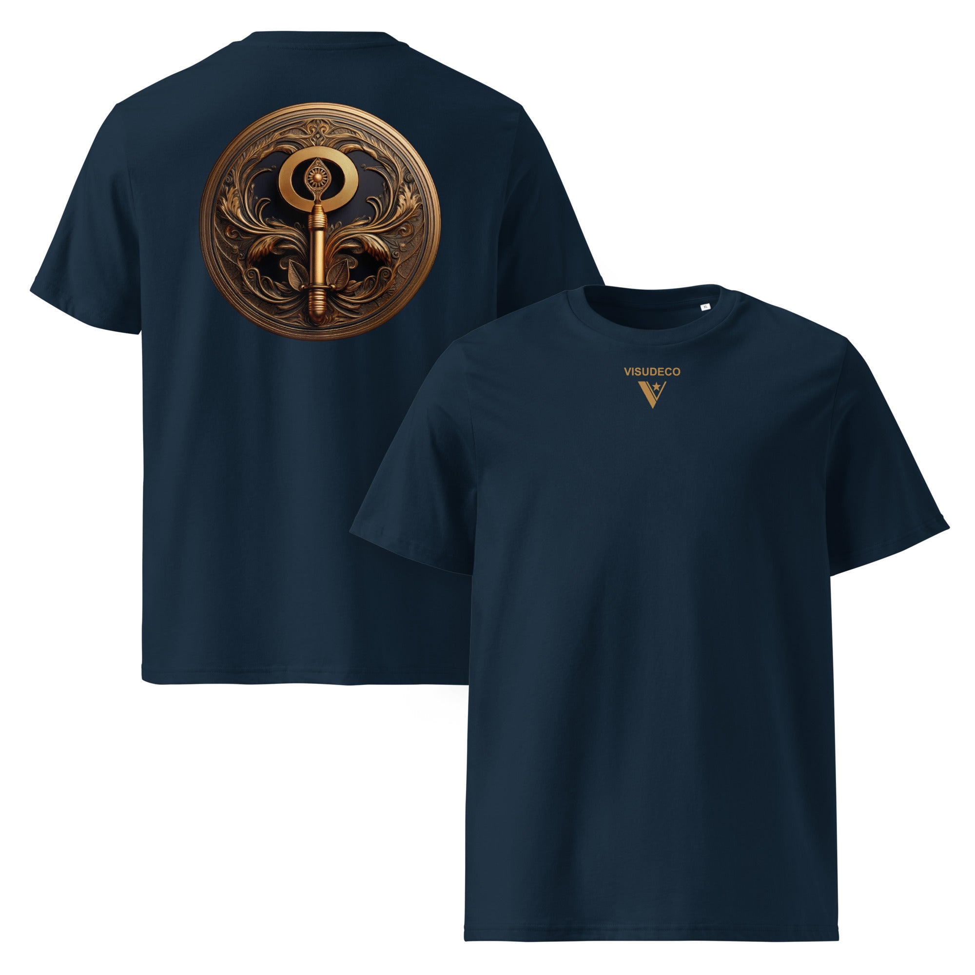 Empatiens Nøgle - Økologisk Bomulds T-Shirt i Navy Blue har VISUDECO® logoet trykt foran og et fiktivt symbol - designet af Mark W. - trykt bagpå.