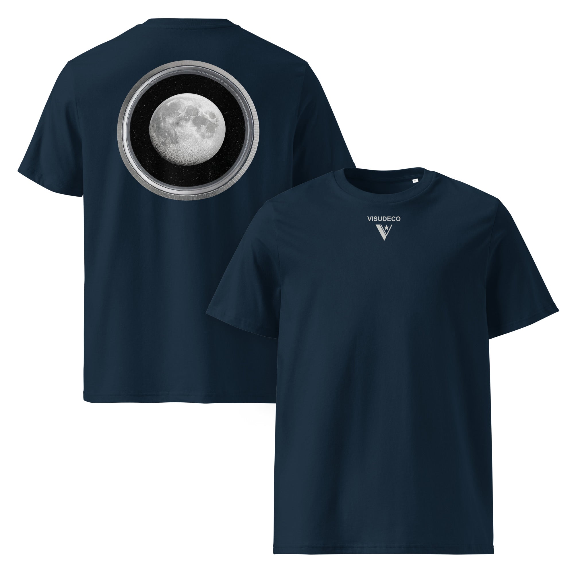 Denne raffinerede marineblå t-shirt i økologisk bomuld har et elegant månemotiv på ryggen, suppleret af det stilfulde VISUDECO® emblem på forsiden - en gennemtænkt fusion af himmelsk æstetik og førsteklasses bæredygtigt stof.