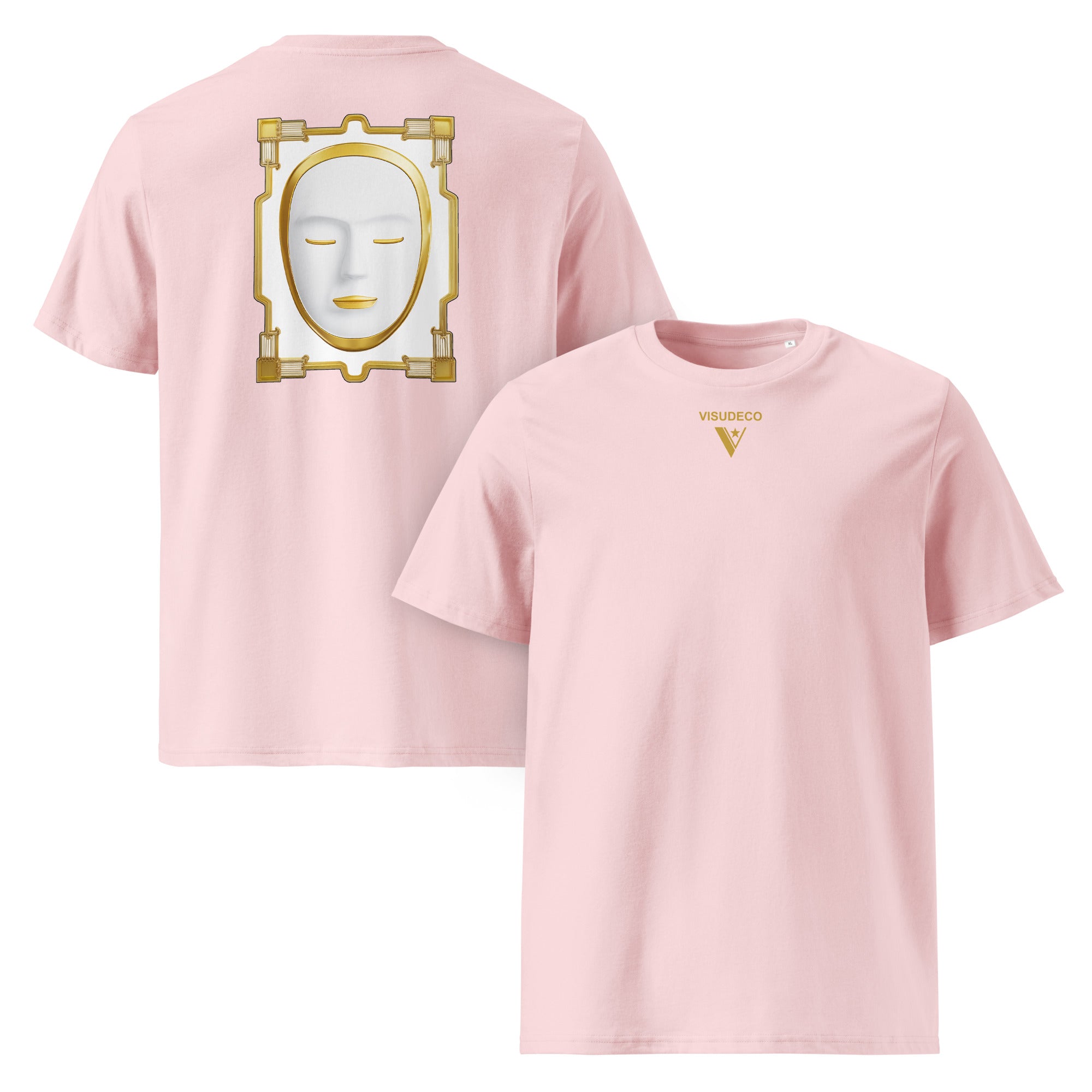 Den Sovende - Økologiske Bomulds T-Shirt i Lyserødt, har et design af et sovende persons ansigt trykt på ryggen, og VISUDECO® tekst med logo trykt foran-top-midt på brystet.